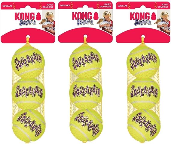The KONG Squeak air Ball combines two classic dog toys - the tennis ball and the squeaker toy - to create the perfect fetch toy. Our durable, high-quality Squeak air tennis ball will not wear down your dog's teeth. It's made with a special non-abrasive felt, compared to the abrasive material on normal tennis balls.