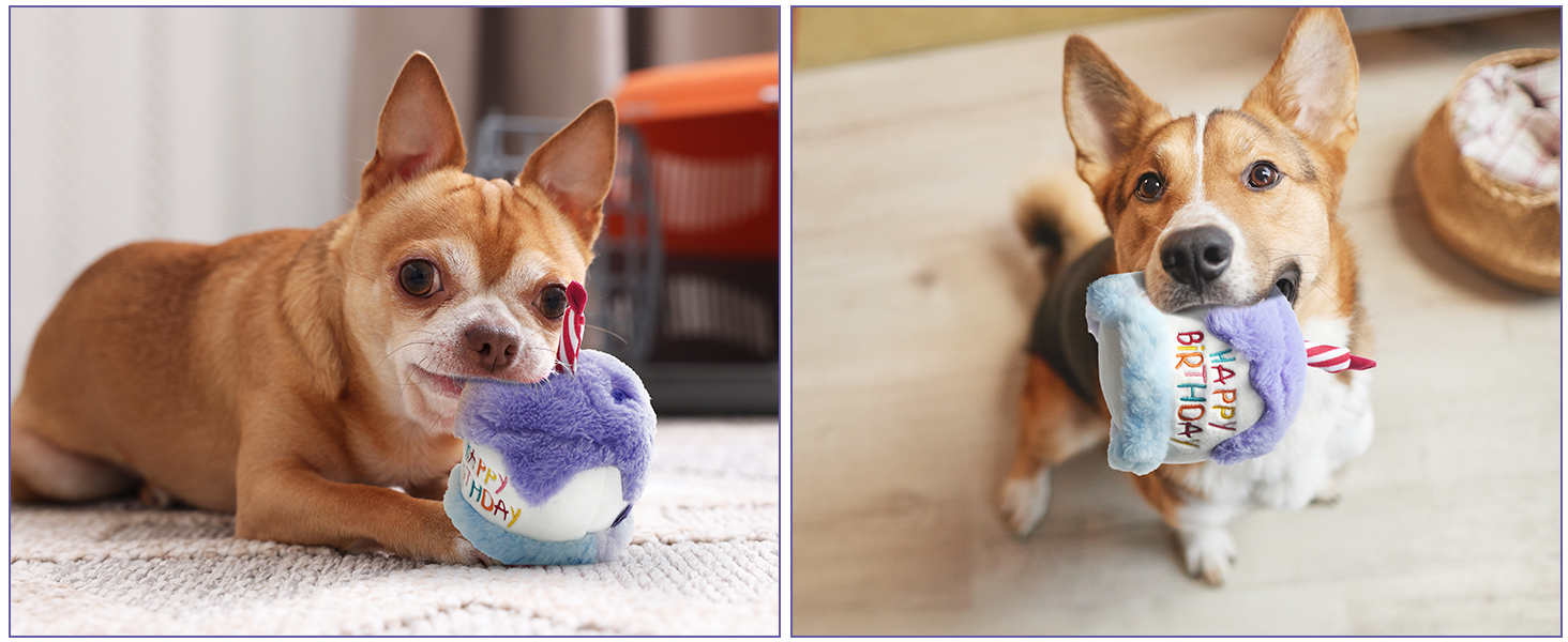 Dog Happy Birthday Cake Toy with Squeaker and Crinkle, Stuffed Plush Puppy Present for Birthday Party, Dog Toy for Small Medium
