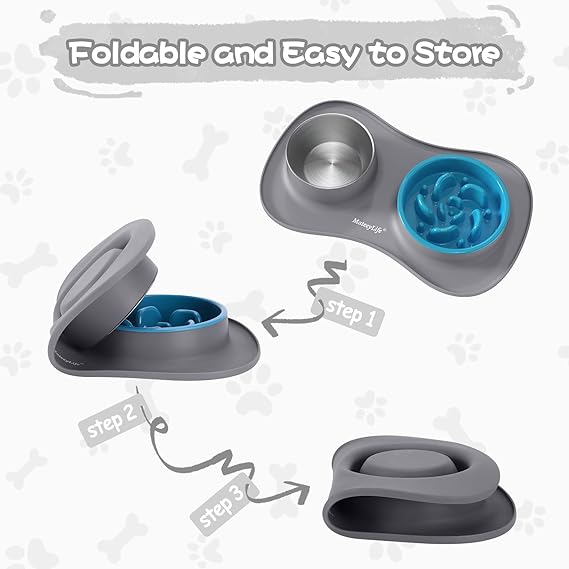 - Easy to Clean and Store: The puppy food bowl features a detachable design, allowing the slow-feeder bowl and stainless steel bowl to be removed for separate cleaning. It is effortless to maintain and can be washed either by hand or in a dishwasher. Additionally, the mat is foldable, it can be folded in half after use, minimizing storage space, perfect for travel