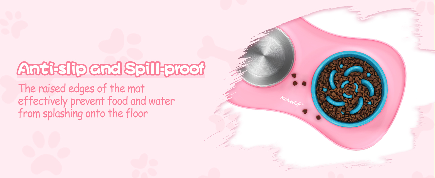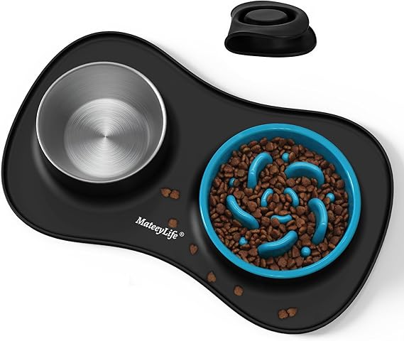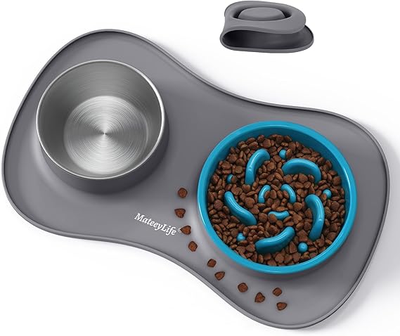 MateeyLife Dog Food and Water Bowl Set 3 in 1, Dog Bowls Slow Feeder & Stainless Steel Water Bowl with Non-Spill Silicone Mat, Cat and Puppy Bowls Pet Dishes for Small Medium Large Breed Anti-Choking