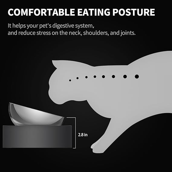 - Raised Bowls can help improve cat’s digestion and 0/15° tilted reduces the strain of leaning bodies, anti cat vomiting.Suitable for all cats and small dogs, this cat feeding bowl is about 5.5 inches wide and 2.6 inches deep. The bowl comes with a wide opening which prevents pets from eating fatigue, while the rounded edges make it easy for cats and dogs to get all the food they need. Deep enough to hold cat and dog food without overflowing