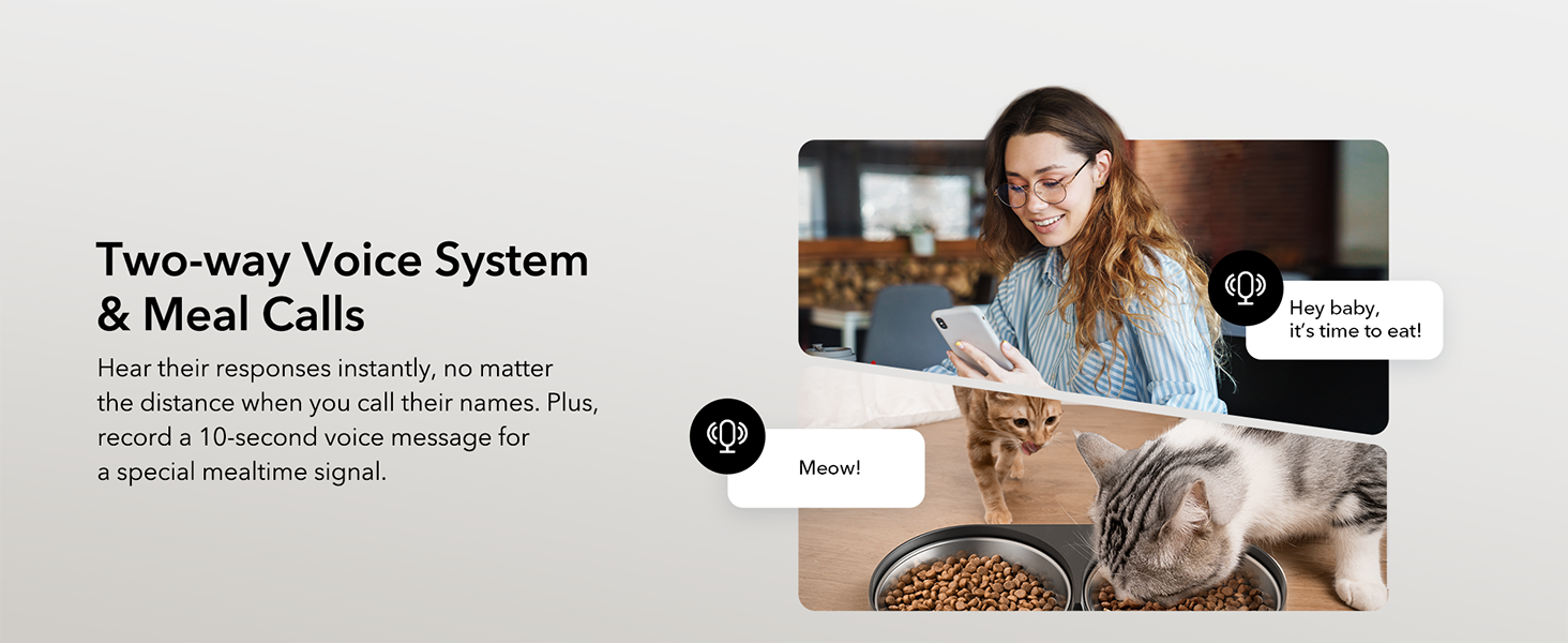 - Two-way Audio & Personalized Meal Call: PETLIBRO automatic pet feeder for cat and dog with built-in advanced microphone and speaker allow you to keep in touch with your pet baby anywhere anytime. Record a voice message(up to 10s) that plays at mealtime, and set the times(0-5) the meal call play, deliver reminders or just send an “I love you”. The old one is deleted when a new voice recording is done. Easily check the food level through the transparent window and add food in time