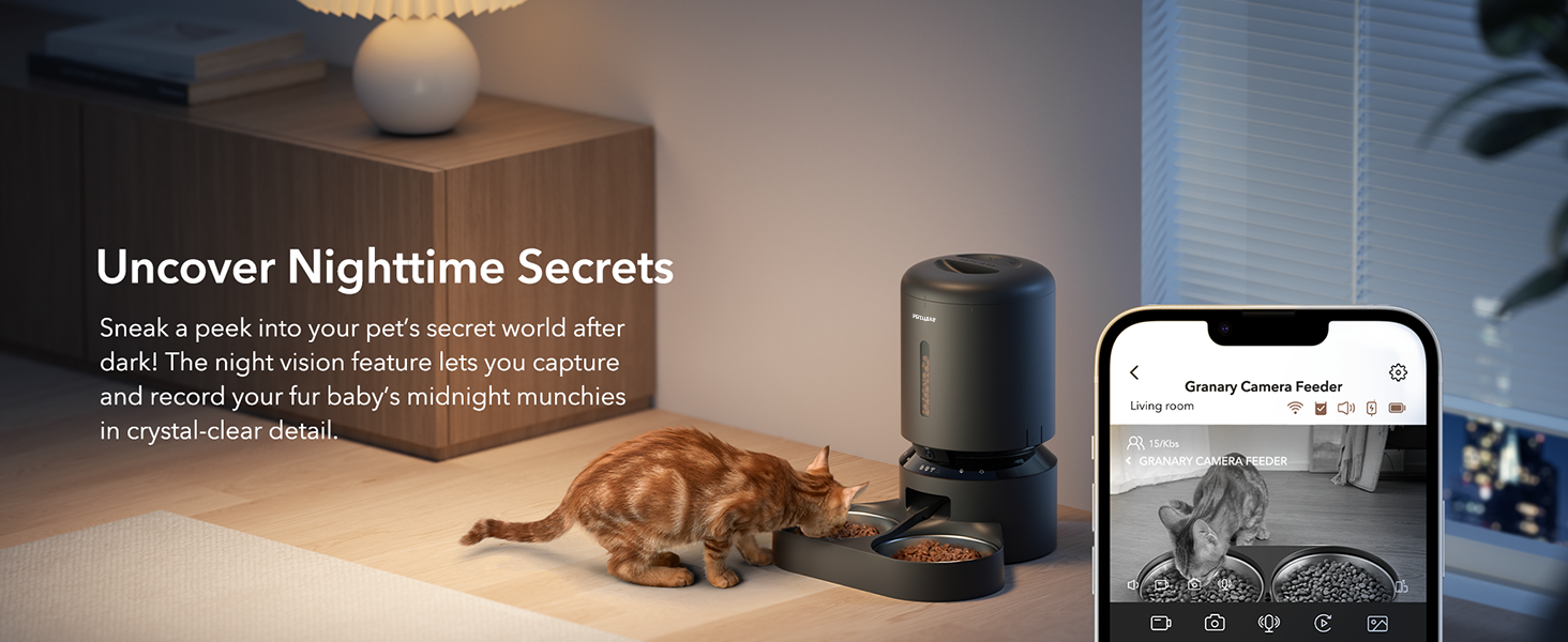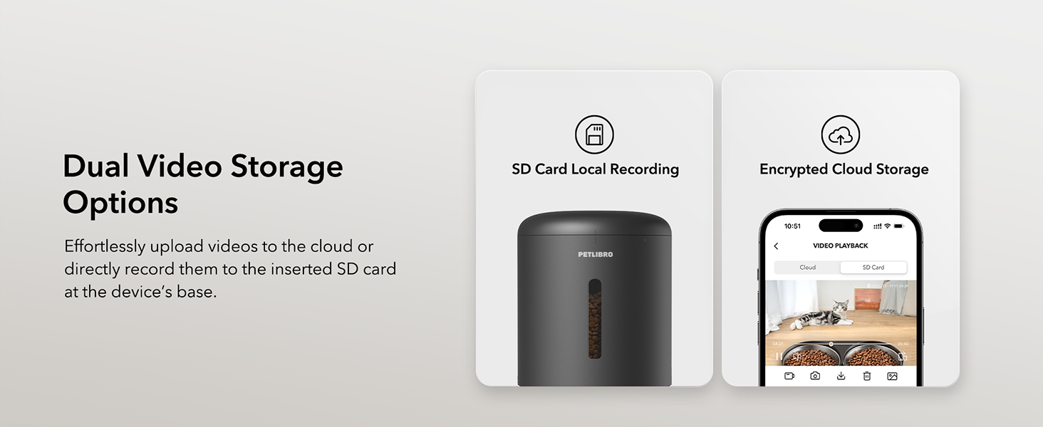 - 1080P HD Camera for Remote Monitoring: The PETLIBRO smart pet feeder with camera features a high resolution 1080P HD camera with 145° wide viewing angle, allowing you to see&hear your beloved pets and care their eating remotely while on the go. Videos can be saved on mirco SD cards up to 256G or cloud storage for an extra pay online. The built-in camera supports IR night vision for clear monitoring in the dark, helping you learn your pet's eating habits through video playback in the APP