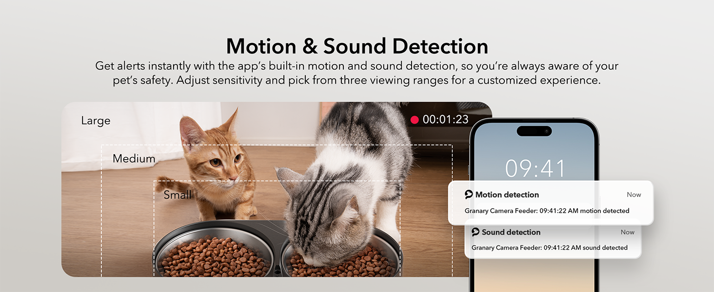 - Motion Detection & Smart Notifications: Once senses movement, the camera records and saves videos of your pets’ activities. You’ll even get alerts on your phone so you can watch in real-time. You can adjust the sensitivity and the viewing ranges as needed. Your phone gets notifications when the food level is low, when a blockage occurs, WiFi is disconnected, the feeder stops working or has other problems. The infrared sensor keeps checking and stops food dispensing if it blocked outlet