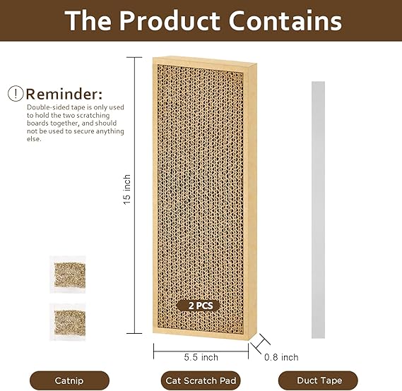 - Splicing Cat Scratching Pad: HappyFreeSX cat scratching pad consists of 2 pieces of 15.5L × 5.5W × 1H cat scratching pad, 2 bags of catnip and 1 pieces of strong adhesive tape, Which can be easily hung on doors and walls. We can also splice 2 pieces of cat scratching pad together with its own strong adhesive tape according to our own needs, So that our cat can use it more comfortably.