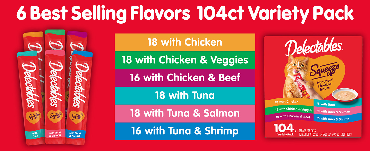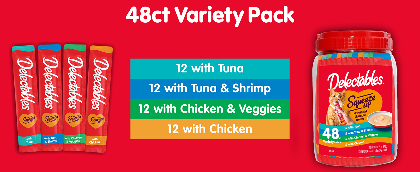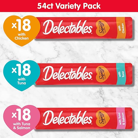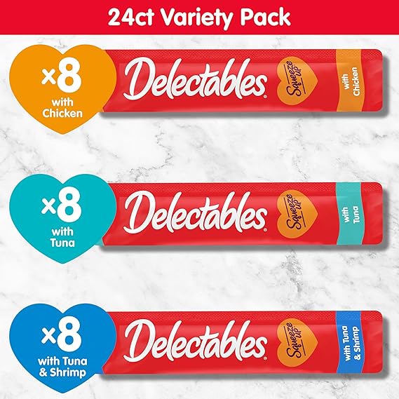 Delectables Squeeze Up Variety Pack, Creamy Squeezable Puree, Lickable Wet Cat Treats, Grain Free, No Added Fillers, No By-Products, No Added Preservatives, 0.5 Ounces Tube, 24 Tubes Total