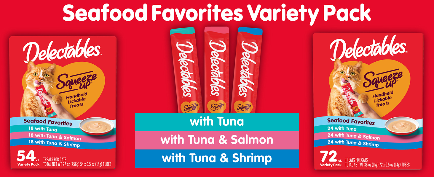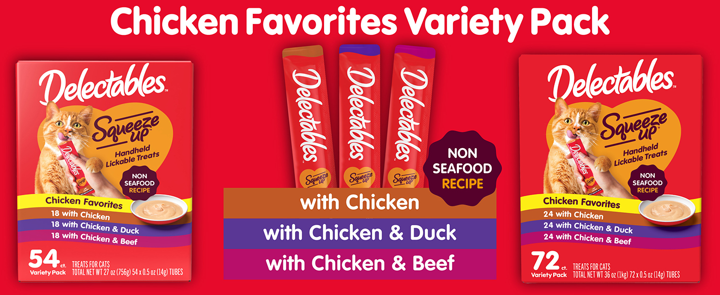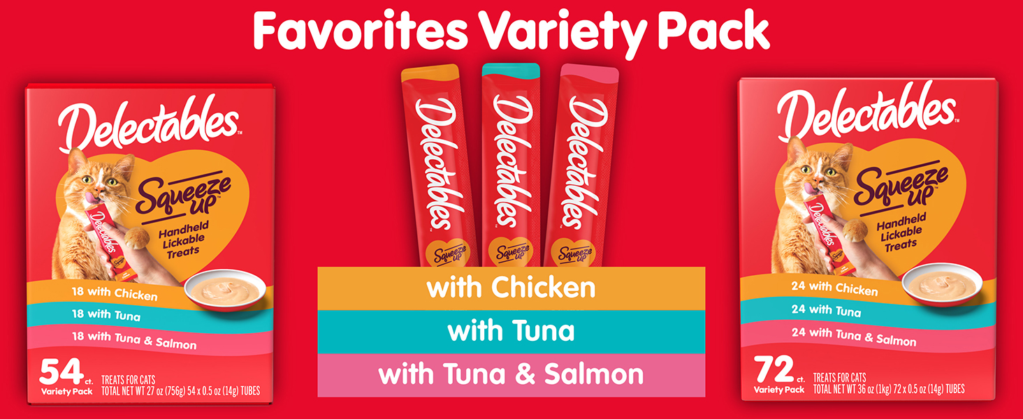 Give your purr-fect pal a treat she’ll crave with Hartz Delectables Squeeze Up Variety Pack Lickable Cat Treats! This treat comes in a rich, creamy, and savory puree that can be squeezed right from the tube for a bonding, hand-feeding experience, or directly into a dish for a yummy snack or food topper. It features real, high-protein ingredients like chicken, tuna, and salmon. Even the most finicky feline will me-wow at the delectable taste!