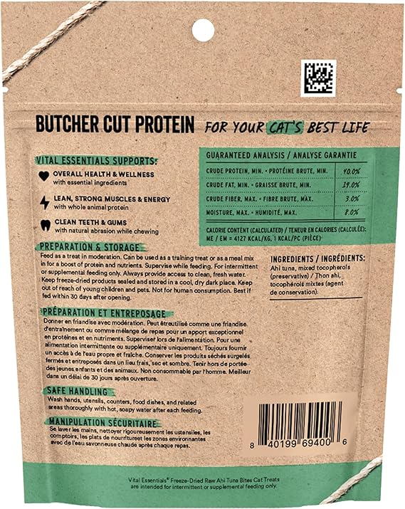 When it comes to treating your cat in its raw diet, superior protein provides superior benefits. Vital Essentials Freeze Dried Salmon Cat Treats are packed with premium butcher cut raw protein, responsibly sourced and humanely harvested, to support your cat's overall health and wellness. Whole animal protein from muscle, organs, and bone marrow delivers lean, strong muscles and energy, digestive health, and clean teeth and gums in every bowl, keeping your pet looking and feeling their best. With Vital Essentials, you can treat raw with confidence and ease, and give your cat the health and vitality they deserve.