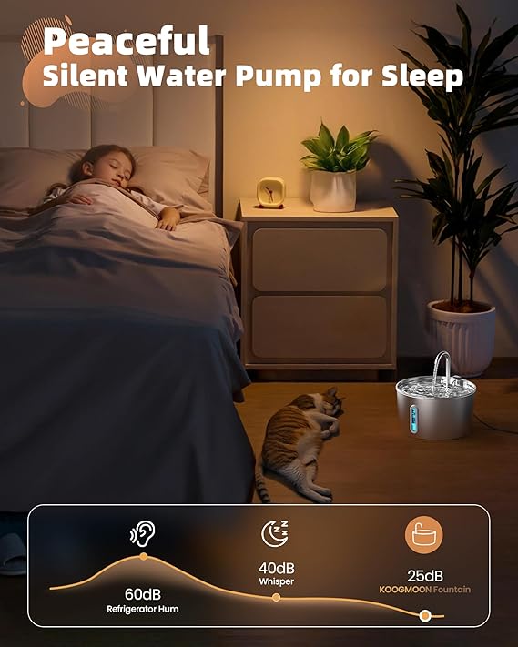 - Ultra-Quiet 5V Pump: The ultra-silent pump(<25dB) will not disturb the rest, sleep or daily activities of you and your pets, whether during the day or at night. You can spend time with your pets in a quiet atmosphere and enjoy a harmonious life. 5V low voltage design, no need to worry about the risk of electric shock to your pets or you by touching the device