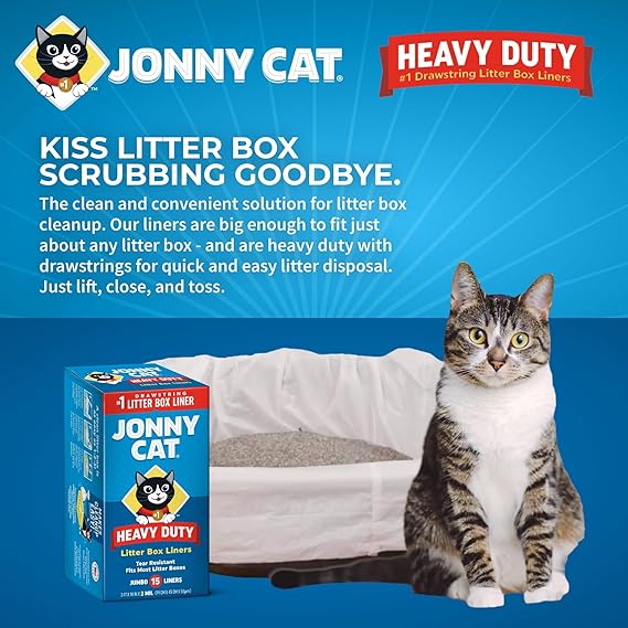Jonny Cat Heavy Duty Tear-Resistant Litter Box Liners are 2 MIL thick so cats' claws and paws can't rip through them. With no waste or spillage stuck to the litter box, Jonny Cat Liners make cleanup easy. Simply pull the convenient drawstring, close, and dispose. No mess, no stress!