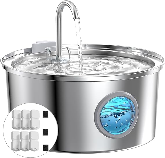 - 【GIOTOHUN Is Trustworthy】 "Making the lives of pets and owners smarter" is the philosophy of the GIOTOHUN brand. Our products allow your pet to get enough water while saving you time. If you have to go out, you don't have to worry about your pet being thirstyh.The cat fountain stainless steel has 3.2L (108oz), the cat fountain stainless steel filled with water can provide your pet with 8-10 days of drinking water.