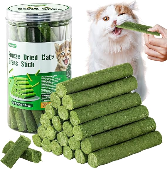 - Oral Health Benefits: Our cat grass stick helps improve dental health by reducing plaque and tartar, freshening breath, cleaning teeth. The plant fiber in the snack also aids in the elimination of hairballs, which can increase appetite in your cat