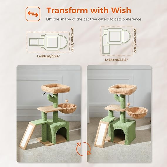 PETEPELA Cactus Cat Tree for Indoor Cats, 32'' Small Cat Tower Cat Condo with Sisal Scratching Ramp, Cozy Hammock and Removable Top Bed Perch for Kittens, Green
