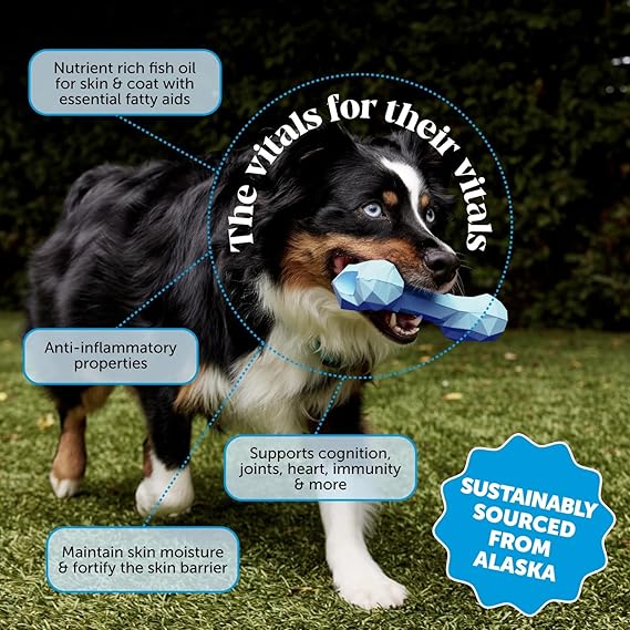 - Made with Natural Ingredients Like Biotin, Vitamin E, Omega-3s, & More: Time is of the essence when it comes to your pup’s wellness. That's why we use effective, proven ingredients. Biotin helps maintain skin moisture and health, Vitamin E protects the skin, Omega-3s support skin health, and fish oil benefits joints, skin, brain, heart, and overall well-being. Collagen-rich bone broth adds a protein boost for extra health benefits.