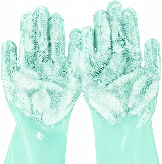 The silicone pet grooming gloves are a 2-in-1 design that combines a cleaning brush and glove. They have 3,000 soft brush heads spread over the magic gloves, which create more foam, increase friction force, and deeply clean the pet's skin. The gloves are made of high-quality silicone, which is non-toxic, high-toughness, and has good elasticity. The anti-skid bumps are non-slip and the extended dog bathing gloves are matched with good elasticity, making them firmly fit on the hand and not easy to fall off. They are suitable for all kinds of furry pets, such as cats, dogs, and rabbits, and can also be used to clean tableware, furniture, cars, clothes, and other items.