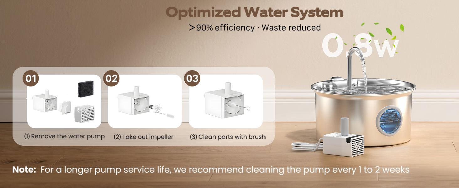 - The Sound of Silence You won’t have to worry about this pet water fountain metal disturbing your sleep. Whether placed in the bedroom, study, or living room, it operates almost silently (≥25dB). Equipped with an ultra-low-power 0.8W pump, it’s highly energy-efficient and eco-friendly. For optimal performance, we recommend cleaning the pump every two weeks to prevent clogging from pet hair.