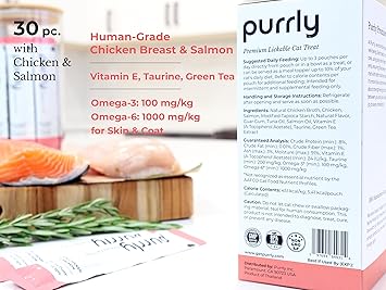 - HUMAN-GRADE PROTEIN SOURCES - Purrly uses only human-grade meat and fish as the primary protein source, exceeding industry standards and ensuring exceptional taste and unmatched nutritional value for your cat. These exquisite treats elevate snack time beyond ordinary treats, offering a truly gourmet experience that satisfies your feline's discerning palate. Each pouch serving unparalled quality and nutrition.