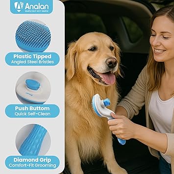 - One-Click Self-Cleaning Brush — This dog & cat slicker brush features an ergonomic handle with a diamond-textured grip for comfortable use. The brush head is safely wrapped in plastic, making grooming easy and gentle on your pet’s skin.