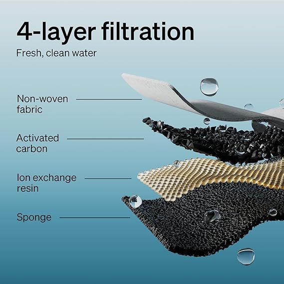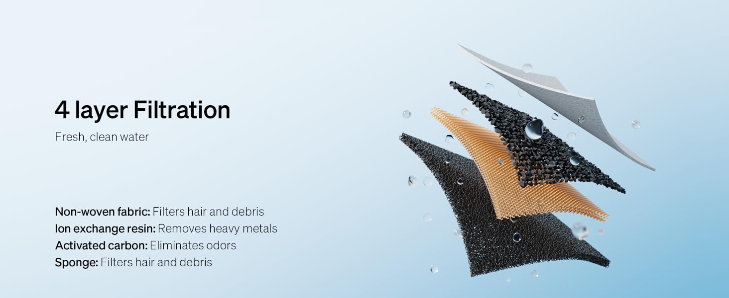 - Vertical Filtration System - The pet water fountains for cats indoor use a multi-layer filtration system to provide your cat with clean, fresh, and oxygen-enriched water. The activated carbon eliminates foul odors, ion exchange resin softens the water and removes heavy metals, the non-woven fabric captures cat hair and impurities, and the built-in pump sponge filters debris to prevent blockages and damage.