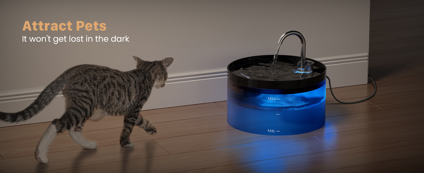 - Built-In Led Light: The cat fountain is designed with a translucent water tank and a built-in LED light. You can check the remaining amount of the cat fountain at any time, without having to frequently open the cat water fountain. At the same time, the built-in LED light can glow in the dark, your cat can find the water fountain faster