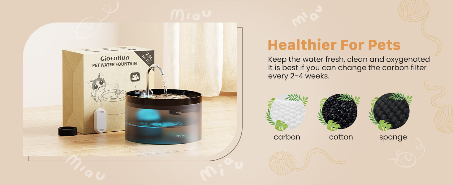 - Triple Filtration System: Pet water fountain adopt a triple filtration system, including activated carbon, high-density cotton layer and sponge filter. This can effectively filter impurities, remove odors, soften the water and extend the life of the pump. It is best if you can change the carbon filter every 2-4 weeks. This will provide your pet with cleaner, fresher, oxygen-rich water