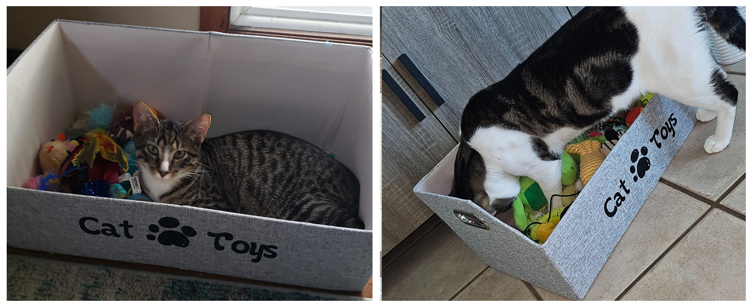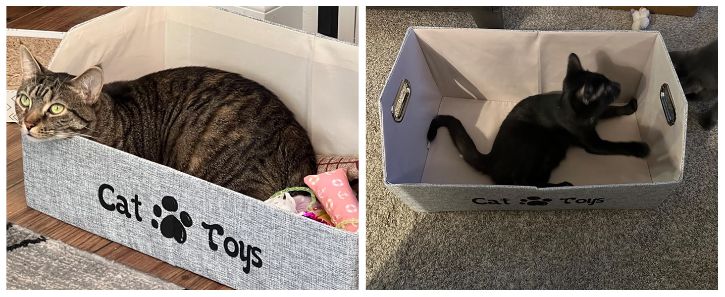 - πππππ Size of 19.7" (Length) x 11.4" (Width) x 8.6"/5.1"(Upper Hight/Lower Hight) cat toy bin, which features the large capacity to keep all your cat's stuff relatively organized, such as cat toys, cat treats, collars, blankets or other pet supplies.