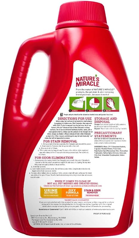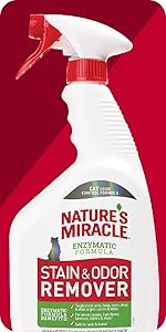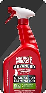 Nature’s Miracle® pet stain and odor removers have been trusted for pet mess cleanup for more than 35 years. Whatever pets do, you can trust Nature’s Miracle® stain and odor removers, training aids, disinfectants and litter products to undo. Nature’s Miracle® Advanced Stain & Odor Eliminator has a severe mess enzymatic formula that produces enzymes when it comes in contact with a food source, such as pet urine, feces, vomit and other bio-based messes. The enzymatic cleaner will continue working as long as the food source is present. This formula also includes patented microbes that target your toughest pet odors. When used and stored as directed, this product is safe for use on carpets, hard floors, furniture, fabrics and more. Nature’s Miracle® Advanced Stain & Odor Eliminator also freshens with a light fresh scent. This product is safe for your pets and home, when used and stored as directed. Trust Nature’s Miracle® products when finding solutions for a clean home and a happy, healthy pet.