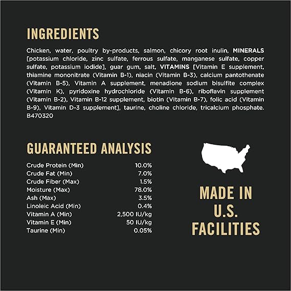 Make meals extra special with Purina Pro Plan SPECIALIZED Sensitive Skin and Stomach Grain Free Chicken Entree wet cat food. We make this sensitive digestion cat food with real chicken as the number1 ingredient, and our high protein cat food supports her strong muscles. The highly digestible cat wet food formula nourishes her skin and coat, and it's easy for her sensitive stomach to handle since it contains no corn, wheat, soy, artificial colors or preservatives. With 25 essential vitamins, minerals and nutrients, including taurine, an essential amino acid, each meal provides your adult cat with 100 percent complete and balanced nutrition. Natural prebiotic fiber helps support her digestive health. We include antioxidants in this grain free cat food for a healthy immune system. We proudly manufacture our canned sensitive stomach adult cat food at Purina-owned facilities so you can feel confident she is getting only the very best Purina cat food.