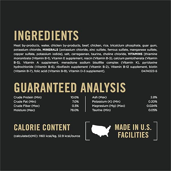 Meat By-Products, Water Sufficient for Processing, Turkey, Poultry By-Products, Poultry Giblets, Rice, Salt, Guar Gum, Potassium Chloride, Added Color, Carrageenan, Taurine, Mono and Dicalcium Phosphate, Zinc Sulfate, Thiamine Mononitrate, Vitamin E Supplement, Ferrous Sulfate, Niacin, Copper Sulfate, Manganese Sulfate, Calcium Pantothenate, Vitamin A Supplement, Menadione Sodium Bisulfite Complex (Vitamin K), Pyridoxine Hydrochloride, Riboflavin Supplement, Vitamin B-12 Supplement, Biotin, Folic Acid, Vitamin D-3 Supplement, Potassium Iodide. A-4742-5.5.