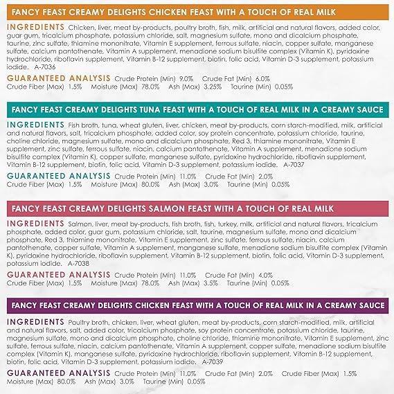 Bring mouthwatering variety to your cat's daily diet with Purina Fancy Feast Creamy Delights adult wet cat food variety pack. Four delightful entrees give your cat an array of mealtime options, with recipes that feature tuna, chicken or salmon for a taste she loves. Tender, grilled morsels and smooth pates offer palate-pleasing textures she can't resist, while the essential vitamins and minerals in every serving help support her health. Each wet cat food in this variety pack features just the right touch of milk and is easily digestible, giving her the creamy, delicious texture she craves in her dish. Since each recipe comes in a convenient pull-tab can, there's no cleanup to worry about. She gets gourmet meals made from high-quality ingredients, and you get the satisfaction that comes from serving her nourishing meals backed by a brand you can trust. Get the variety your cat loves and the quality you do by ordering this Purina Fancy Feast variety pack for adult cats from Amazon.com.