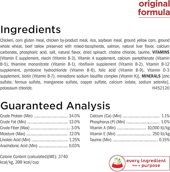 Serve your cat a great tasting meal with Purina Cat Chow Naturals Original Cat Kibble featuring high-quality ingredients like real chicken as the #1 ingredient. This wholesome weight management cat food is also made with real salmon and whole grains. Formulated for all life stages, this delicious hairball control cat food follows your cat through their kitten and adult years. Made without artificial flavors, colors or preservatives, each bite delivers more of the ingredients cats need without the ones they don't. Your cat gets a 100% complete and balanced Cat Chow indoor dry cat food at mealtime, and you get the comfort that comes from giving them a natural cat food backed by a trusted brand. With 25 essential vitamins and minerals, this Purina indoor cat food gives cats the nutrition they need to help them live a long, happy life with you. Make this Purina chicken and salmon cat food a part of their daily feeding routine and show your cat you care about their health and wellness.