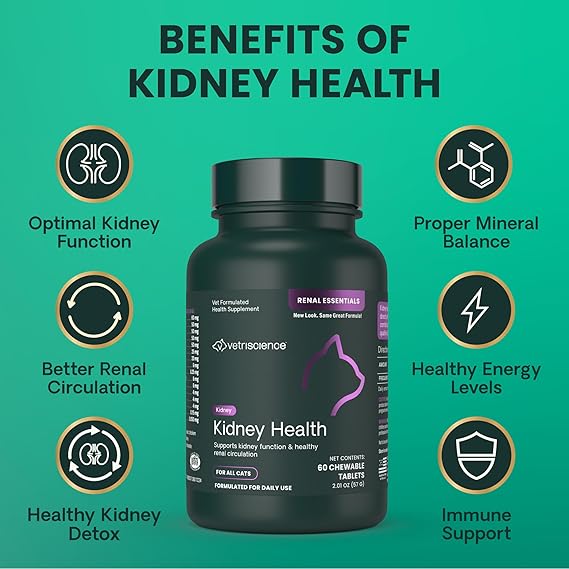 Support your cat's kidney function and healthy levels with VetriScience Kidney Health (new name, same great Renal Essentials formula), a vet-formulated kidney support supplement for cats designed to promote optimal kidney function and overall canine renal health. Perfect for senior pets, cats who struggle with adequate hydration, or those needing additional kidney care, these kidney chewable tablets for cats combine antioxidants, adaptogens, herbs, and omega fatty acids to help boost renal circulation, filtration, and waste elimination. This comprehensive kidney supplement for cats is trusted by veterinarians and formulated to help maintain renal health, proper mineral balance, and normal fluid retention, making it one of the best supplements for cat kidney health. Ingredients like Rehmannia glutinosa, known as "the kidney's own food," support kidney function in cats and promote blood flow through the renal system. Astragalus root, Cordyceps sinensis, and DMG help support detoxification, immune health, and healthy renal circulation. Nettle seed extract provides antioxidant benefits, supporting kidney cell health and repair, while B vitamins boost energy and metabolic processes that are critical for renal health. Omega-3s EPA and DHA encourage a healthy inflammatory response, further safeguarding kidney function. Whether you’re looking for cat renal vitamins, daily canine kidney support, or effective kidney chewable tablets for cats, Kidney Health helps provide easy cat kidney care. Kidney Health chewable tablets have been tested for palatability, with a tempting flavor that even sensitive cats will enjoy. Give as a treat, or break or crush to mix into food for picky pets. Our dog and cat supplements are certified by the National Animal Supplement Council (NASC), routinely undergo third-party testing, and contain no hidden ingredients, artificial dyes, or synthetic colors or preservatives.