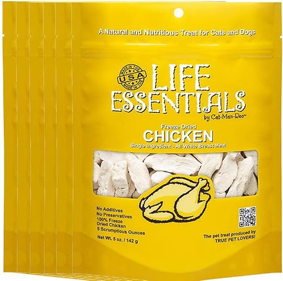 LIFE ESSENTIALS BY CAT-MAN-DOO All-Natural Freeze Dried Chicken Treats for Dogs & Cats No Grains, Fillers, Additives and Preservatives Proudly Made in The USA - 6 Pack (5 oz. Bag)