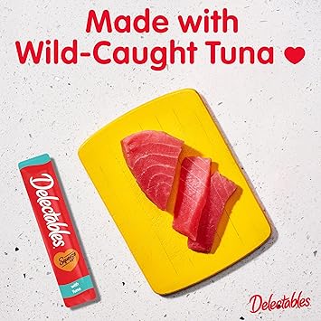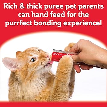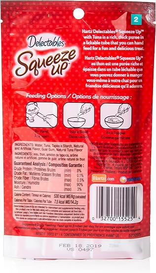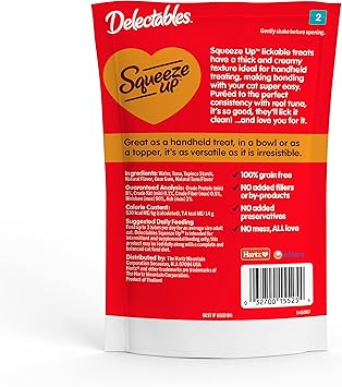 Squeeze up some fun with Delectables Squeeze Up interactive wet cat treats, taking treat time to a whole new level (or, giving treat time a whole new meaning!) Each .5 ounce lickable tube is stuffed with a rich and thick creamy puree in lip smacking flavors cats find absolutely pawtastic!! Squeeze Ups provide the purrfect bonding experience between you and your cat as you playfully and lovingly hand feed this irresistible treat directly to her. Hand feed or use as a savory food topper to entice finicky eaters to lick the bowl clean.