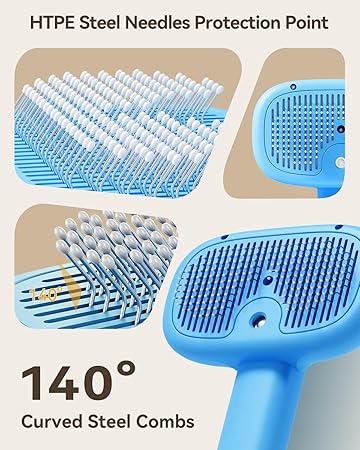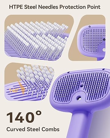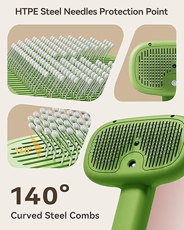 - Instant Self-Cleaning Pain-Free & Stress-Free for Pets : Vet-tested rounded pins + silicone nodules glide through mats painlessly. Safe for dogs/cats/rabbits and all fur types. Rounded 140° pins (vs. sharp 90° combs) gently stimulate skin, prevent scratches, and calm nervous pets. One-click self-cleaning ejects hair instantly - no messy cleanup.