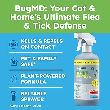 BugMD Pet Safe Flea Spray for Cats & Home | Natural Indoor Flea Killer & Tick Prevention | Plant-Based Flea Treatment for Carpet, Furniture & Cat Trees with Essential Oils