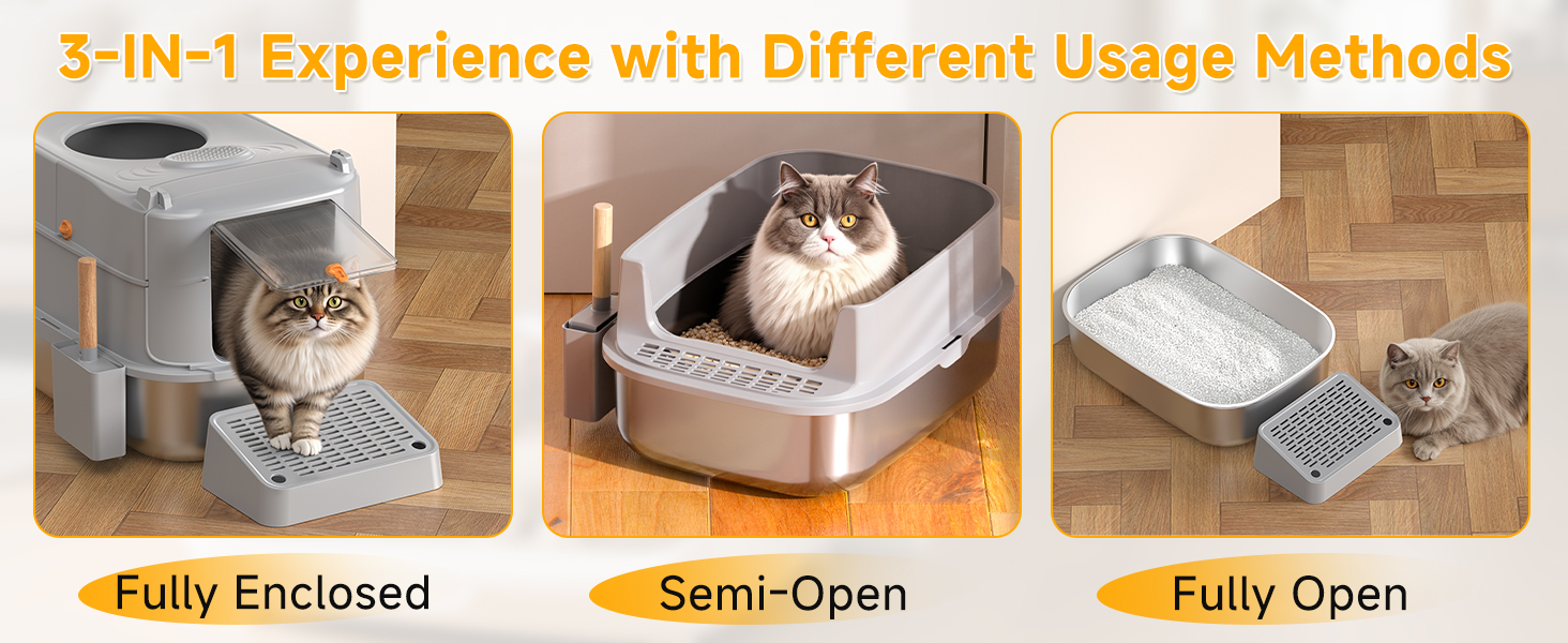 - MULTIFUNCTIONAL MODE: Our stainless steel litter box with lid features an easy-to-assemble modular system that offers two configuration modes. The fully closed mode has an activated charcoal filter to adsorb odors and also prevents urine leakage, making it suitable for home environments. The semi-closed/open door mode enhances ventilation for easy cleaning or adapting to your cat's habits