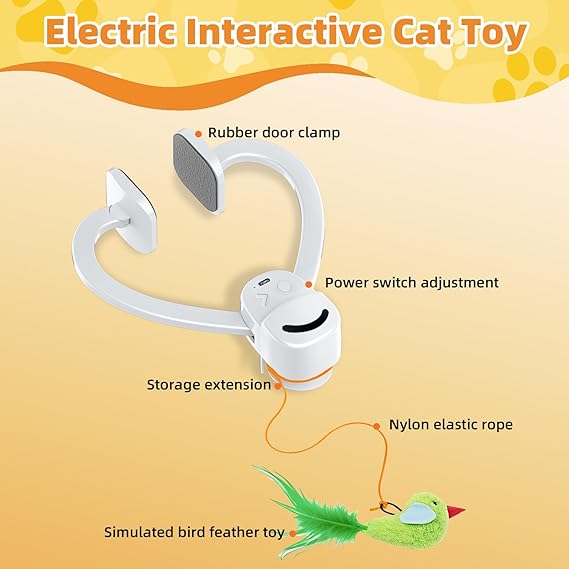 - Cat Doorway Toy Complete Set -Cat toys for doorway ready to Play Right Out of the Box Includes: 1x Flying bird Toy for Cats(attracts cats with realistic motion) 2x Elastic Strings (adjustable length for different play styles) 1x USB Charging Cable (convenient rechargeable) 1x Color Box + User Manual (easy setup)Enrichment for indoor cats perfect for keeping cats entertained automatic cat toy doorway.