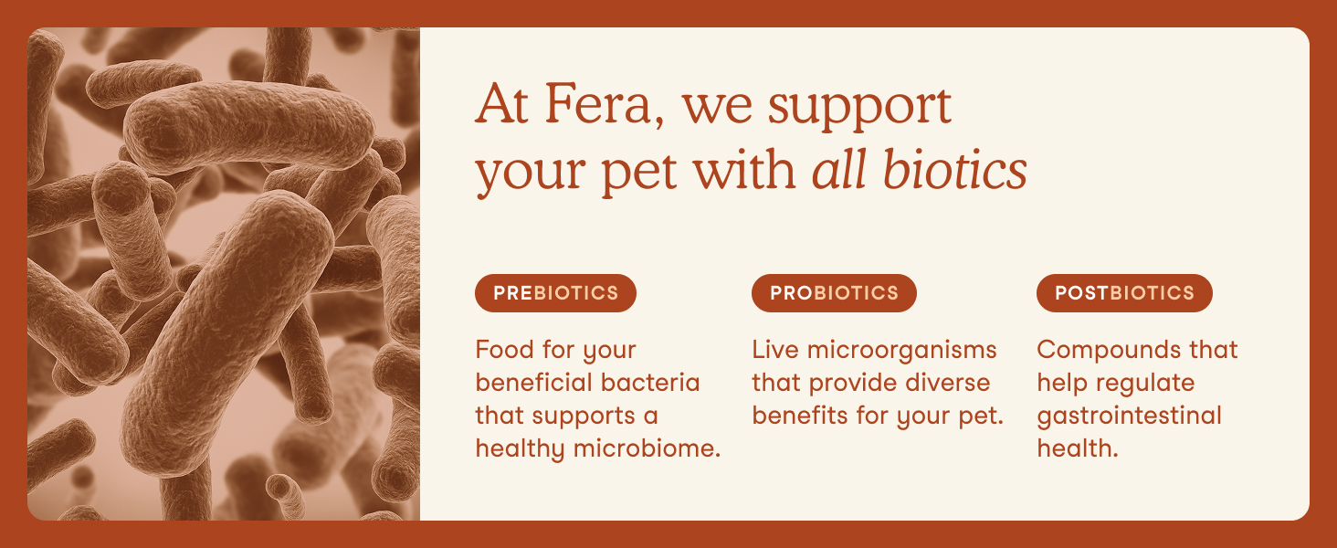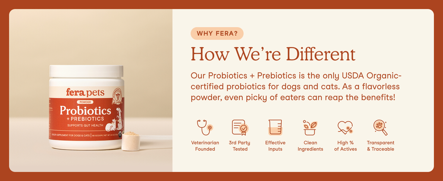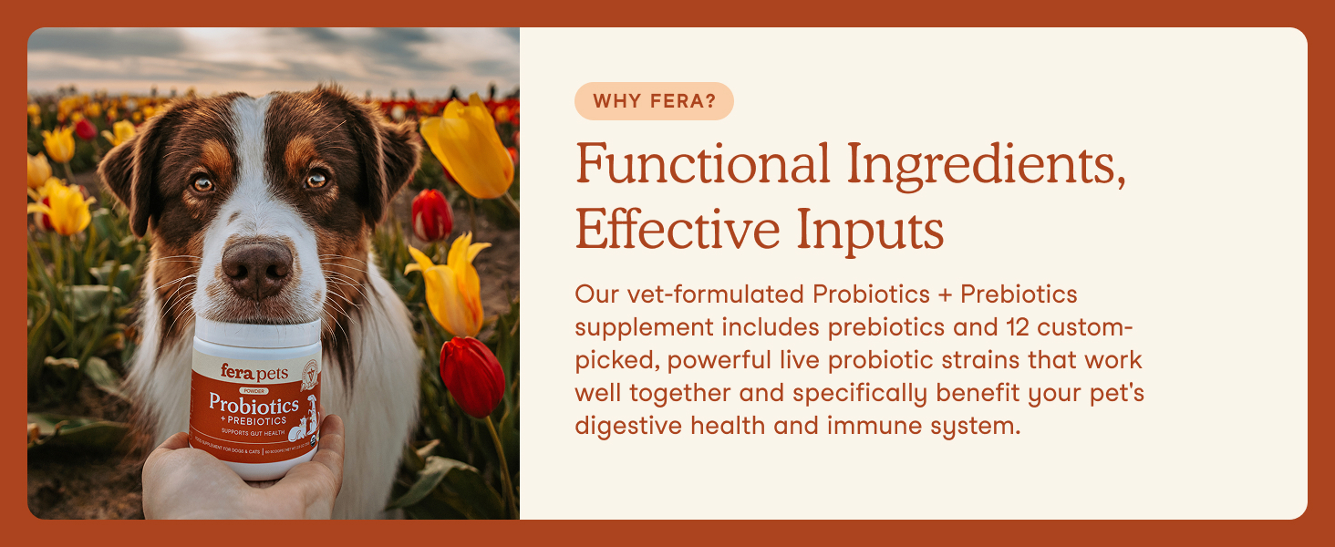 - Powerful pet probiotics: Fera’s prebiotics and probiotics promote optimal gut and digestive balance; flavorless powder with 12 hand-selected strains, plus organic prebiotics helps with immunity, digestion, energy, metabolism, skin, coat, and dog allergy