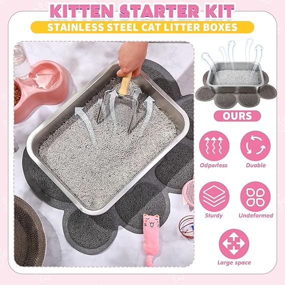 1 x Stainless steel cat litter box, 1 x Cat litter shovel, 1 x Cat litter mat, 1 x Automatic drinking bottle and feeding bowl