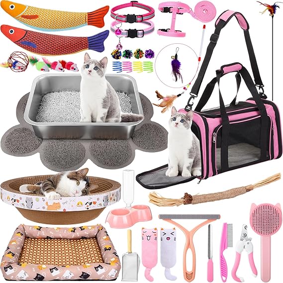 38 Pcs Kitten Supplies Starter Kit Cat Essentials Set Include Cat Scratcher Cardboard Stainless Steel Litter Box Bed Carrier Kitten Toys Accessories for Welcome Gift Supplies