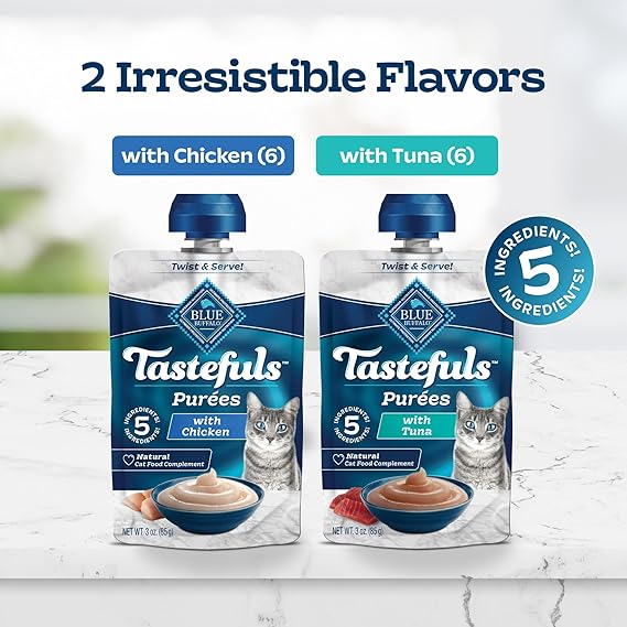 Blue Buffalo Tastefuls Purées Variety Pack, Natural Cat Food Complement, Resealable Twist Cap Pouches, Chicken and Tuna, 3-oz (12 Count, 6 of Each Flavor)