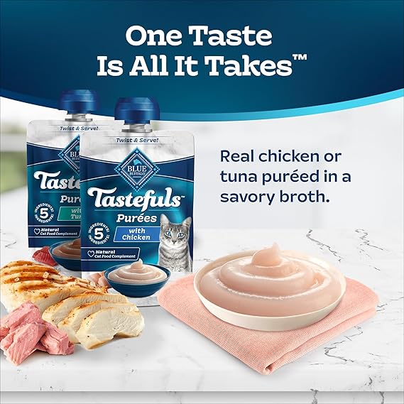 So tasty, we could only call it one thing. This BLUE Tastefuls Purées Chicken & Tuna Variety Pack features a natural cat food complement with a taste and texture cats love. Made with just five ingredients, including real chicken or tuna, this wet cat food makes a tasty snack, topper, or treat you can feel good about. The convenient twist-cap pouch is easy to open and reseal. That means simple portioning with less mess, and if you have leftovers, simply refrigerate the pouch and serve again later. Like all Blue Buffalo cat food recipes, BLUE Tastefuls Purées contain no chicken (or poultry) by-product meals. It's also free of corn, wheat, and soy, and contains no artificial flavors or preservatives.