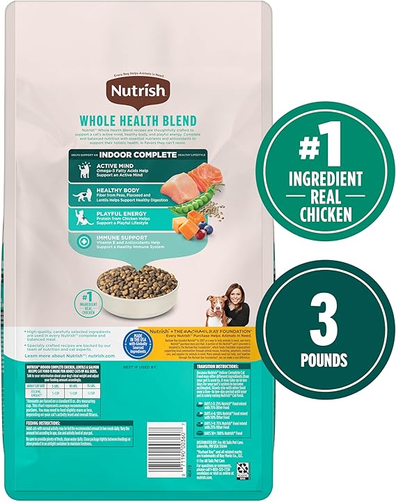 Give your cat the holistic nutrition they deserve with Nutrish Indoor Complete Chicken, Lentils & Salmon Recipe Dry Cat Food. Packed with the irresistible flavors, it isn’t just tasty — this indoor dry cat food is designed to support your cat’s active mind, healthy digestion and playful energy. This unique formula combines omega-3 fatty acids, natural prebiotics and high-quality protein to help your feline thrive. Plus, it’s made with natural ingredients with essential vitamins, minerals and Taurine to keep your cat feeling their best. And when you choose this wholesome dry cat food meal, you’re also giving back — every purchase helps animals in need through The Rachael Ray Foundation. Get some today and feed your cat the delicious nutrition they deserve.