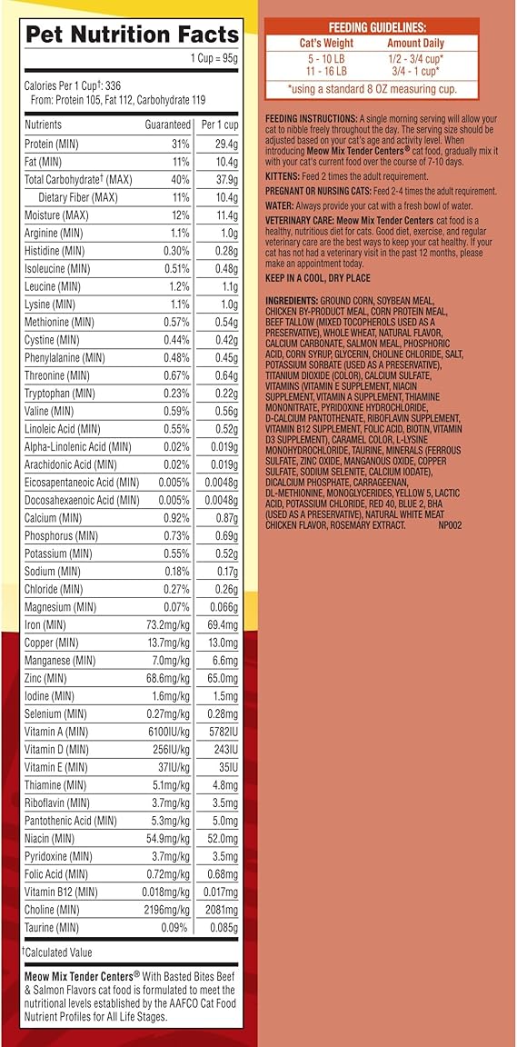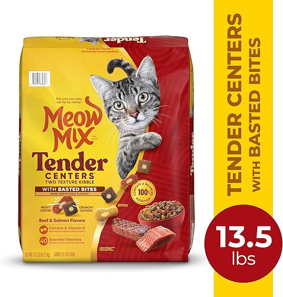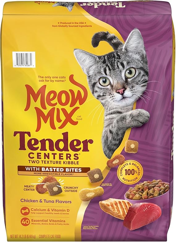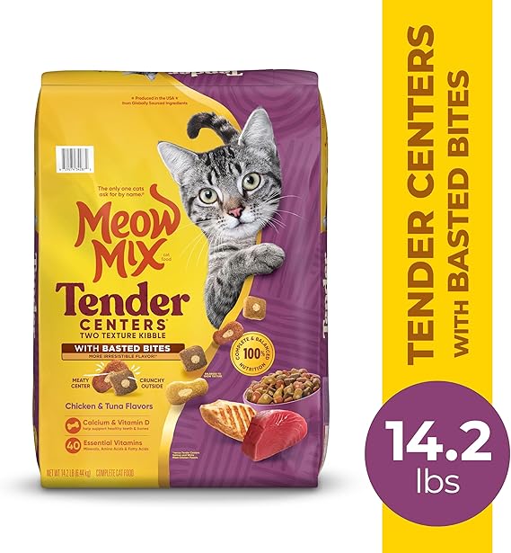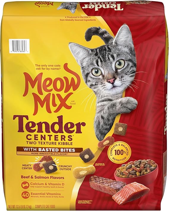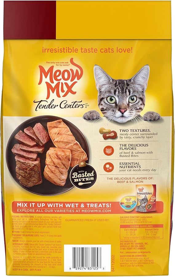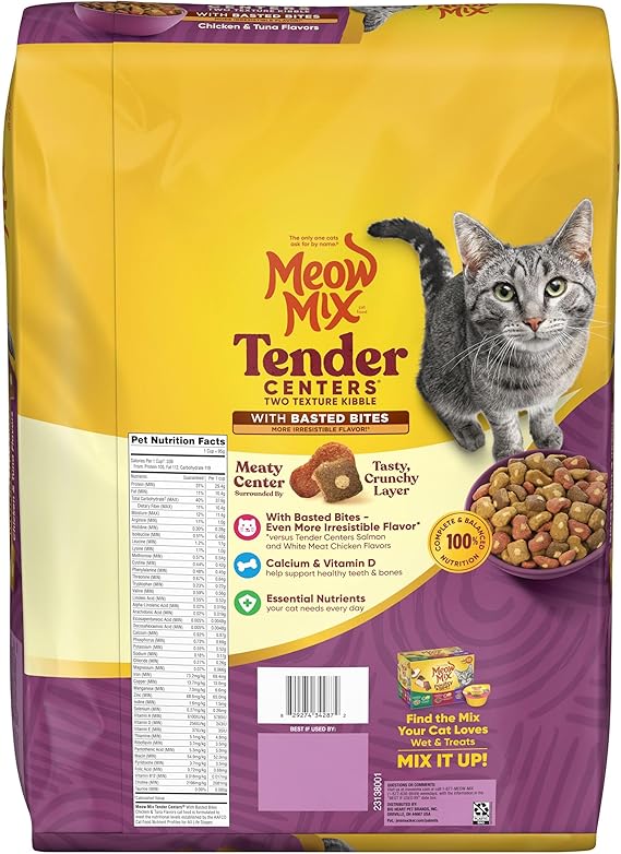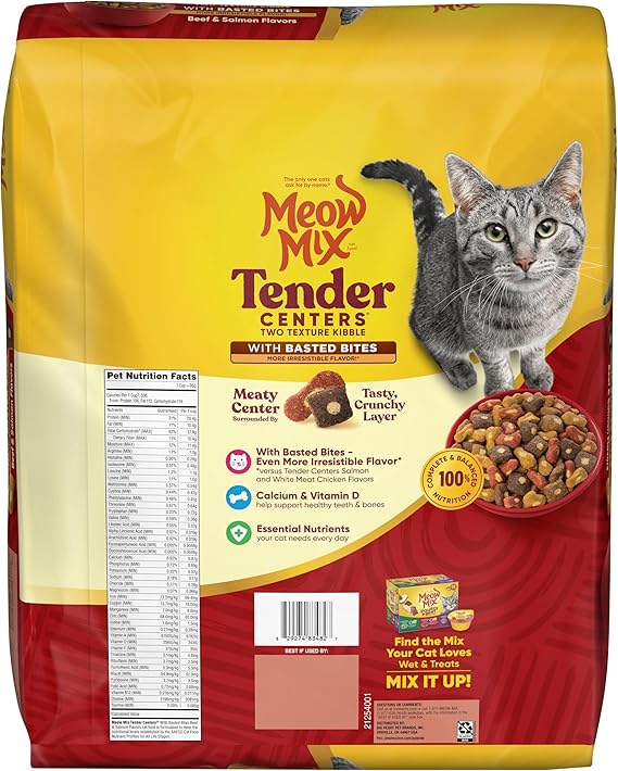 Each bite of Meow Mix Tender Centers Salmon & White Meat Chicken Flavors cat food combines irresistible salmon and chicken flavors with a crunchy outer layer and a meaty center. The protein rich recipe contains essential nutrients to help keep your cat healthy and happy. With wholesome ingredients and irresistible taste, no wonder it's the only one that cats ask for by name!