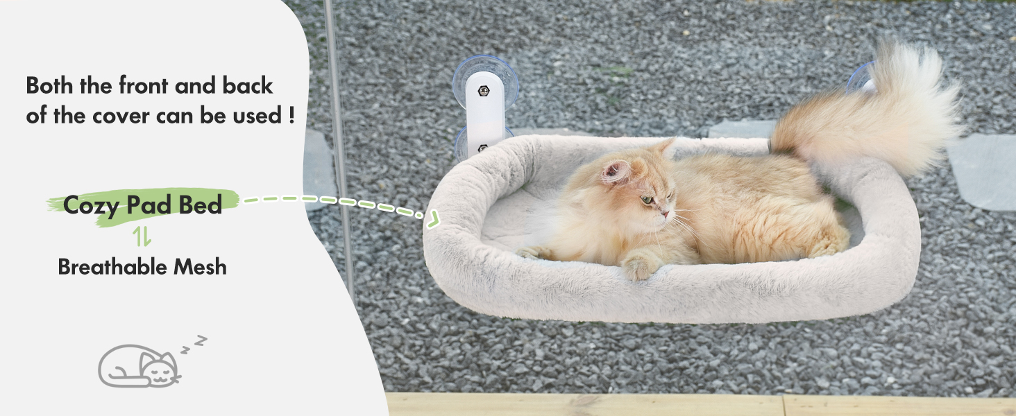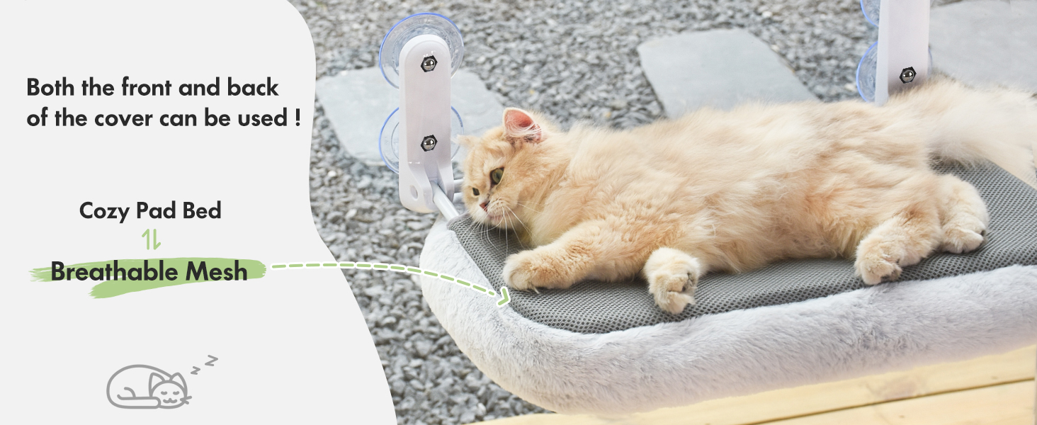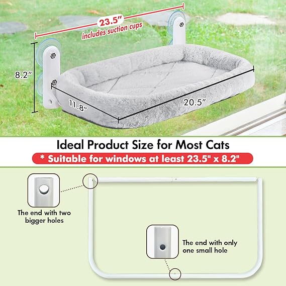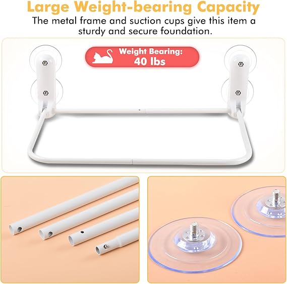 - 【Installation Tips】Before installation, clean and wipe dry the suction cups & window. Then attach the cat perch to the window and press hard the nuts to secure the suction cups to the windows. Lastly, press hard around the rim of each suction cup to squeeze out the air. If suction cups fail, soak them in hot water (90°C) for 3 mins to recover the shapes.
