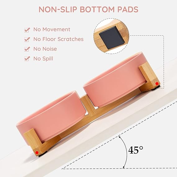 - [Double Bowl Design]:One dog bowl for food and one for water, Each ceramic cat bowl has a Unique wooden stand, raising the dishes closer to your pet for more comfortable eating