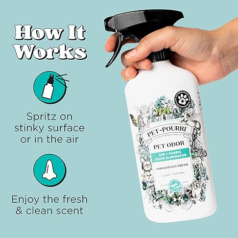 Pet-Pourri Pawsitively Fresh Pet Odor Deodorizer Spray Love your pets, but not their smells? Pet~Pourri Pawsitively Fresh Pet Odor Deodorizer Spray is your go-to pet and home deodorizer, powered by our Proprietary Funk Lock Technology. This multi-surface odor remover doesn’t just mask smells, it removes funky odors at the source. Infused with a light, uplifting blend of Pineapple, Jasmine, and Pear, this Air Fabric freshener spray keeps your home and pets smelling amazing between cleanings. Suitable for use in the air and on fabrics, it refreshes pet bedding, furniture, carpets, couches, rugs, and even car seats, making it a must-have for pet owners. Made with natural, plant-based ingredients and pet-friendly essential oils, so you can freshen your space without worry. Whether it’s your furry friend’s favorite corner or a surprise mess, a quick spritz helps freshen the space with a naturally clean scent—up to 800 uses per bottle. From the makers of Poo~Pourri, Pet-Pourri lives up to the Pourri Promise—plant-based, stink-stopping solutions that work anywhere odors lurk. Whether it’s shoes, trash cans, diaper pails, fabrics, or your furry friend’s favorite spot, there’s a Pourri for that.