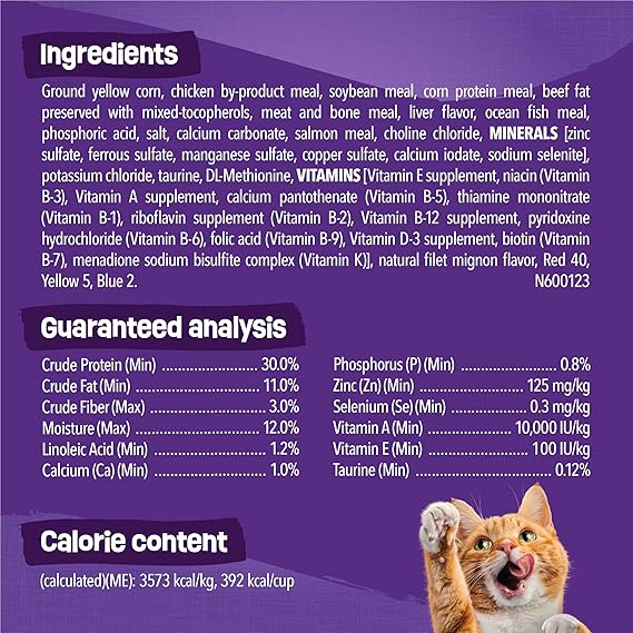 Give your cat all her favorite tastes combined in one sensational serving of Purina Friskies Surfin' and Turfin' Favorites dry cat food. Chicken, Ocean Whitefish, Salmon and Filet Mignon flavors offered in interesting shapes keep her excited about her meals. You can feel good about the essential vitamins and minerals found in this tasty dry cat food that supports her whole-body health. Essential fatty acids help support her healthy skin and coat, while vitamin A and taurine support clear, healthy vision. Antioxidants in this dry cat food promote a healthy immune system. The crunchy texture of our kibble cat food helps to keep her teeth clean. This tempting recipe can follow your cat from her cuddly kitten days to her playful adult years because the formula provides 100 percent complete and balanced nutrition for all life stages. Offer up a hearty helping of this Purina Friskies dry cat food every day, and watch as your feline friend gleefully nibbles her way to the bottom of her dish.