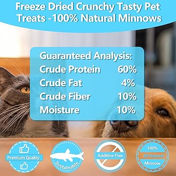 - High Protein- Feeding raw minnows low in calories and high in protein, mega-3 fatty acids and essential minerals to your dogs or cats can result in better nutrient retention, improving skin and coat. Sustains digestive and dental health.
